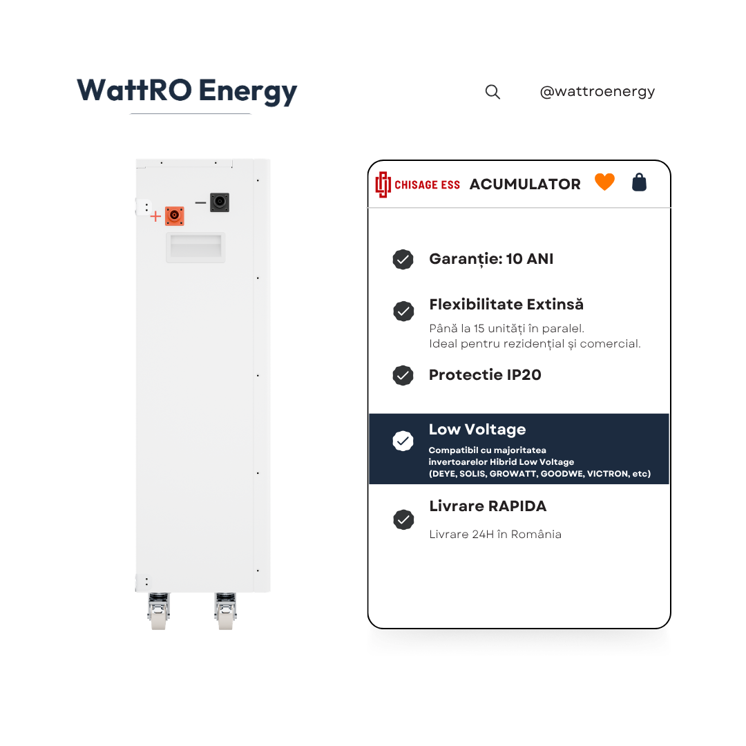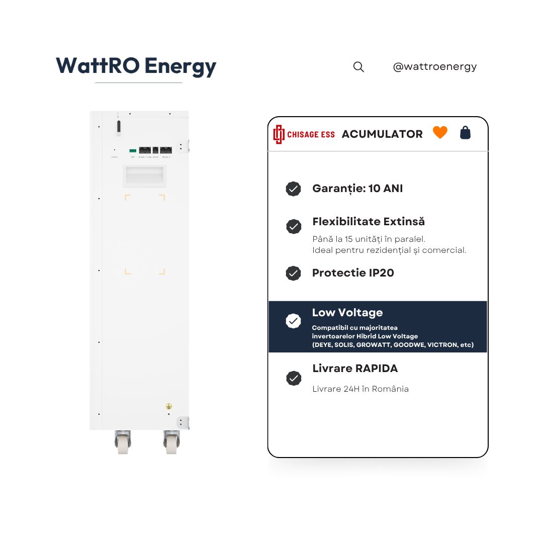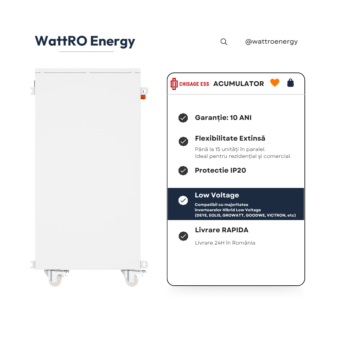 Acumulator Chisage LiFePO4 de 16kWh, ideal pentru sisteme fotovoltaice rezidențiale și comerciale. Permite scalare până la 15 unități, oferind flexibilitate maximă și independență energetică.