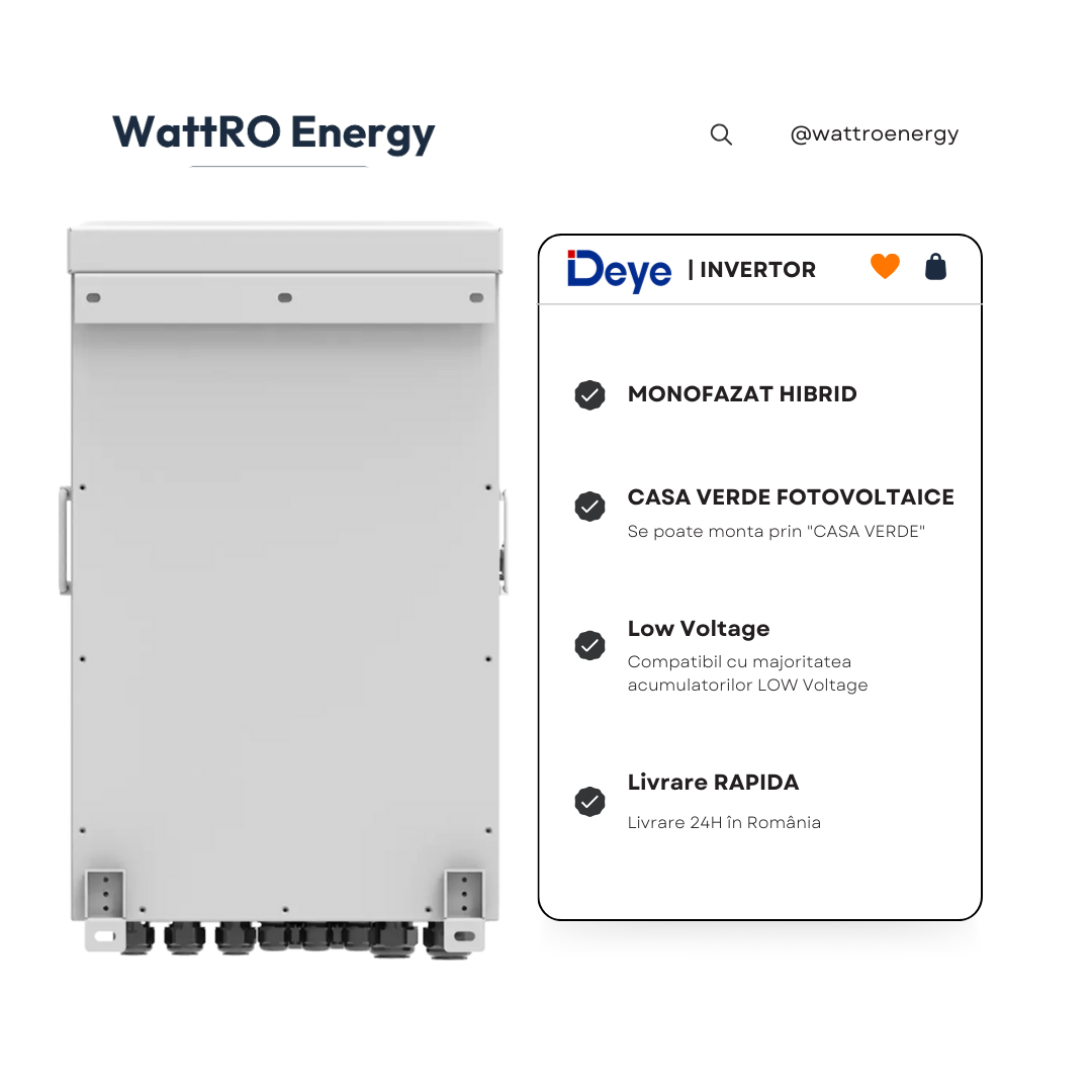Invertorul hibrid Deye SUN-16K-SG01LP1-EU este compatibil cu programul Casa Verde Fotovoltaice, fiind alegerea ideală pentru locuințe. Cu 16 kW putere, protecție IP65 și ecran tactil LCD, oferă eficiență maximă și fiabilitate atât pentru sisteme fotovoltaice on-grid/hibrid cât și off-grid.